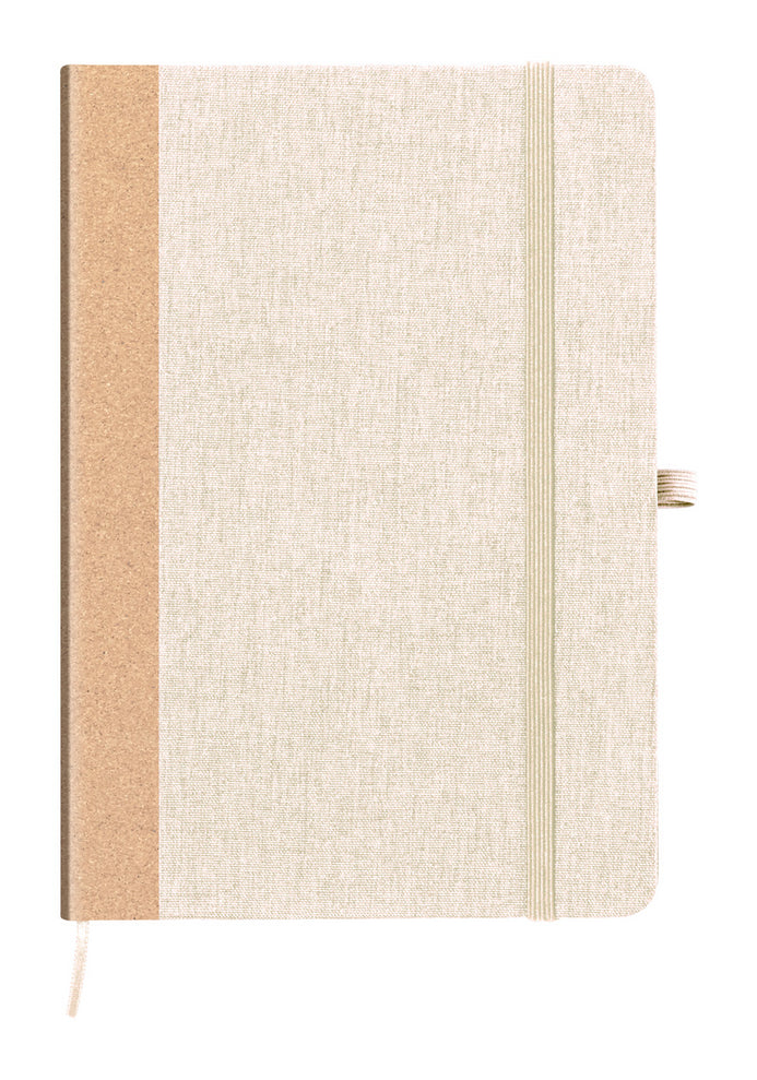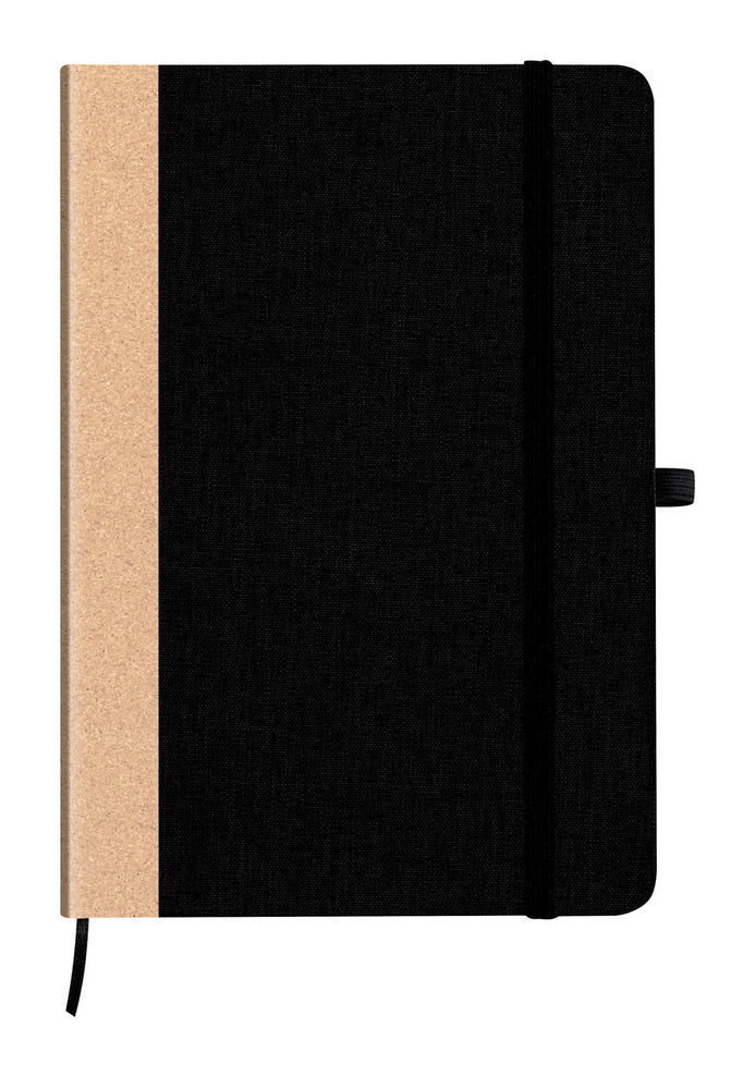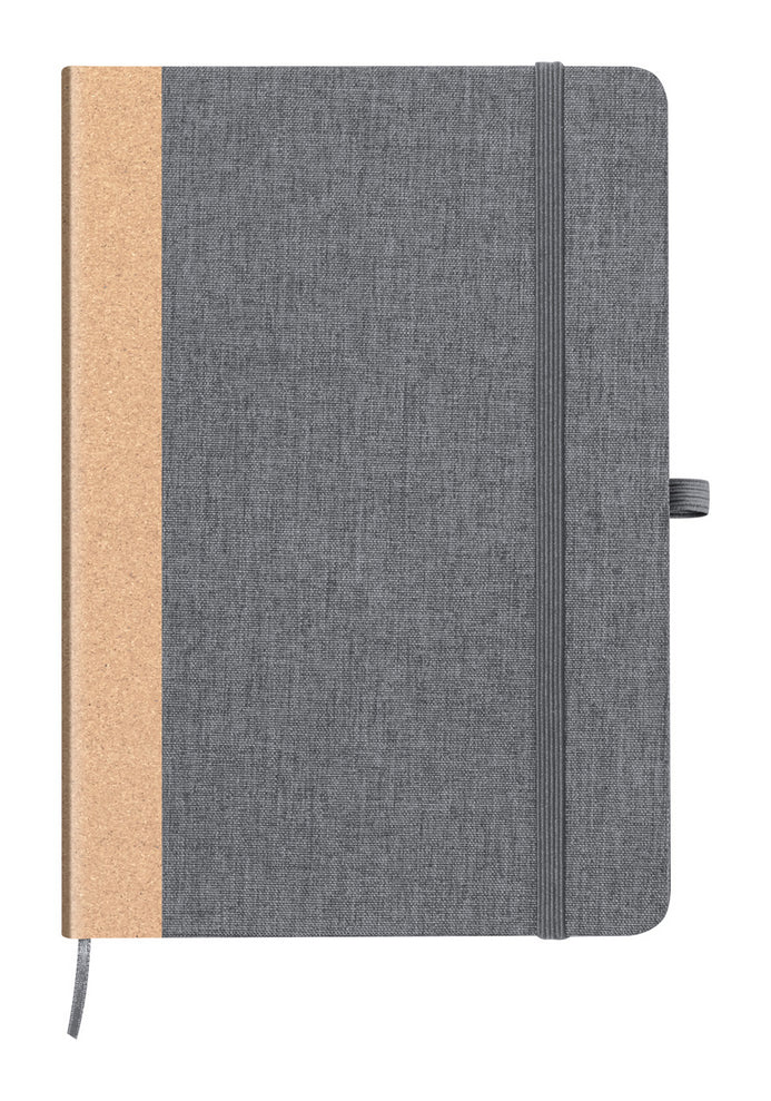 | Descriere | 300D RPET polyester and natural cork covered notebook with 80 blank sheets, bookmark, rubber band and pen holder. |