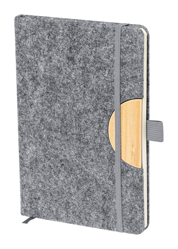 | Descriere | RPET felt covered notebook with bamboo insert and mobile holder function. With 80 lined sheets, bookmark and rubber strap. A5 size. |