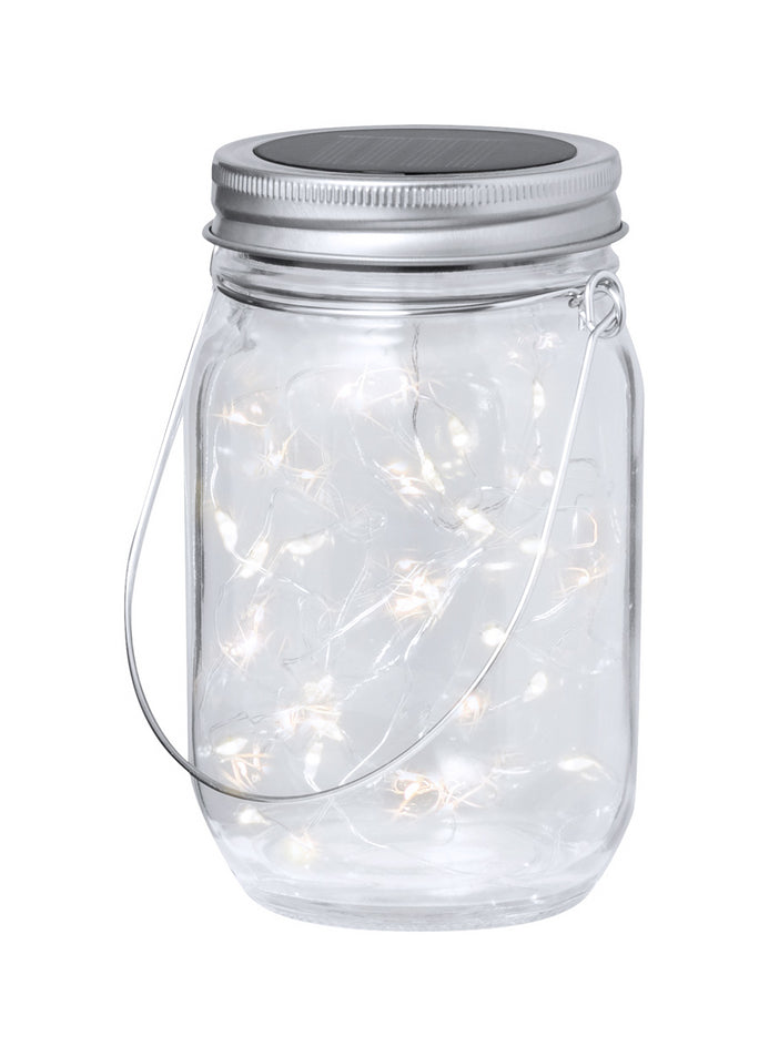 Lampă decorativă alimentată cu energie solară cu 20 LED-uri, în borcan de sticlă cu capac metalic. Cu baterie reîncărcabilă încorporată.