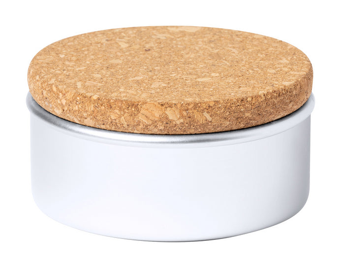 Lumânare de ceară pe bază de plante, cu parfum de vanilie, în borcan de aluminiu, cu capac din plută naturală.
