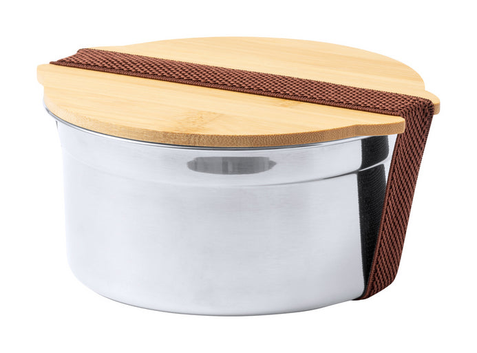 Cutie pentru prânz, rotundă, din oțel inoxidabil, cu capac din bambus și curea elastică. 800 ml.