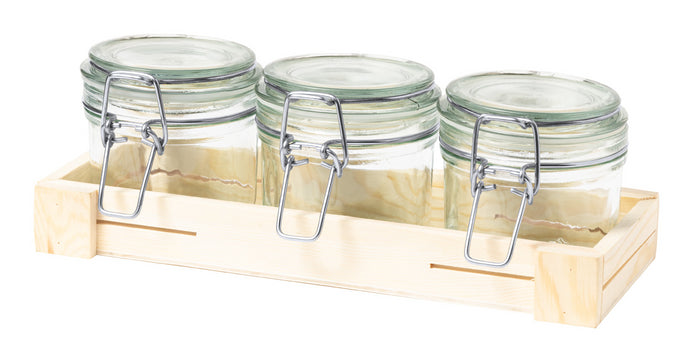 | Descriere | Set de 3 bucăți de borcane din sticlă, cu capace de presiune, din oțel inoxidabil, în tavă de lemn. 230 ml. |