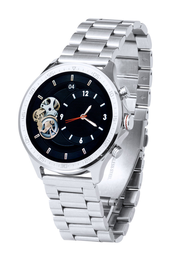 Ceas inteligent bluetooth, multifuncțional. în carcasă metalică, cu ecran tactil TFT de 1,32 inchi, baterie reîncărcabilă de 230 mAh și curea din oțel inoxidabil. Cu mai multe funcții de monitorizare a sănătății și funcții inteligente, cum ar fi monitorizarea ritmului cardiac, a tensiunii arteriale și a oxigenului, apeluri bluetooth, prognoza meteo, și monitor de somn pe lângă multe altele.Poate fi conectat la smartphone-uri cu o aplicație gratuită disponibilă pentru iOS și Android.Inclusiv cablu de încărcare USB.