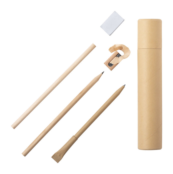 Set de 5 articole de papetărie în cutie din carton reciclat. 2 creioane neascuțite , un pix din hârtie cu mină albastră, un ascuțitor din lemn și o radieră.