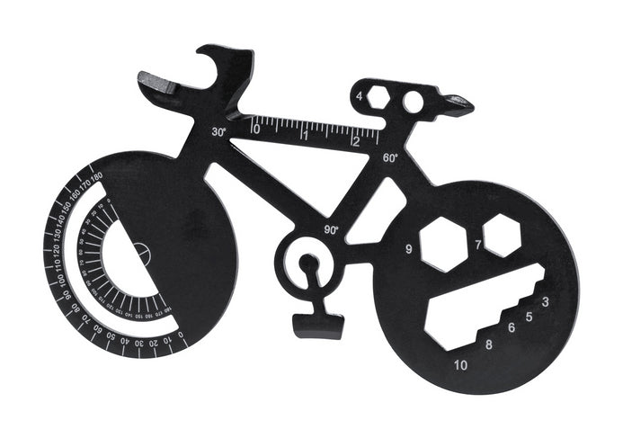 Bicycle shaped, stainless steel multitool with 16 functions.