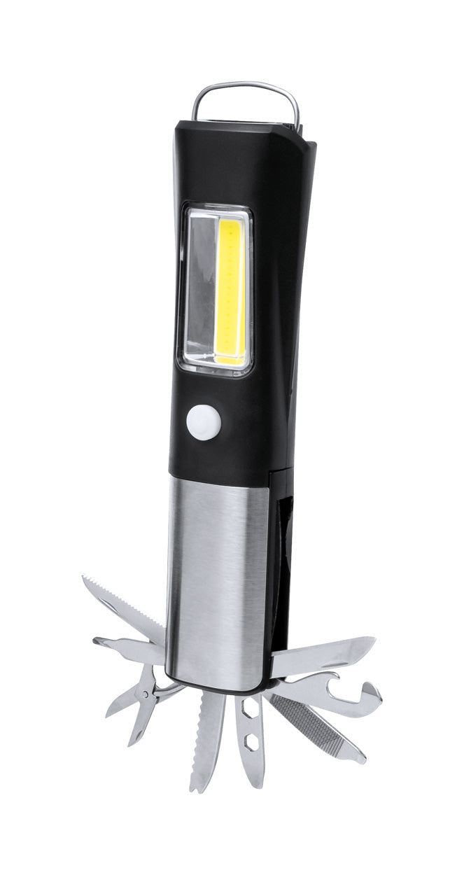 Unealtă multifuncțională din plastic ABS și oțel inoxidabil cu 1 far cu LED, 19 lumini COB, 2 moduri de iluminare și 13 funcții. Funcționează cu 3 baterii AAA, fără baterii.