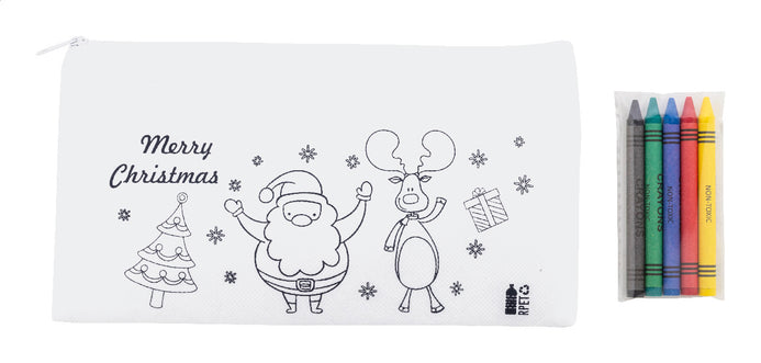 | Descriere | Penar de colorat, de Crăciun, din material nețesut RPET, cu închidere cu fermoar și 5 creioane colorate |