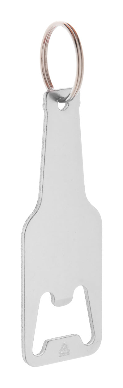 Deschizător de sticle, din aluminiu reciclat, în formă de sticlă, cu breloc metalic.