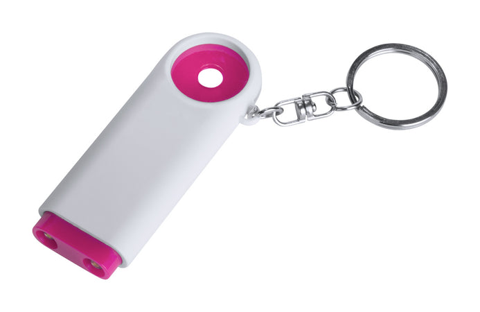 Breloc din plastic cu fisă pentru cumpărături, cu 2 LED-uri. Se livrează cu baterii.
