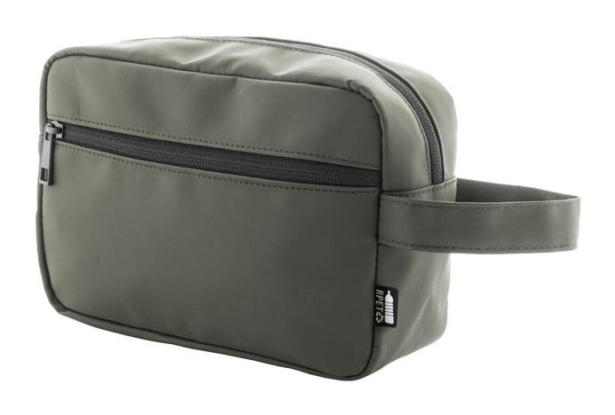 Descriere Geantă pentru cosmetice, din piele moale PU reciclată, cu două compartimente cu fermoar și mâner de transport. Cu etichetă distinctivă din PU reciclată.