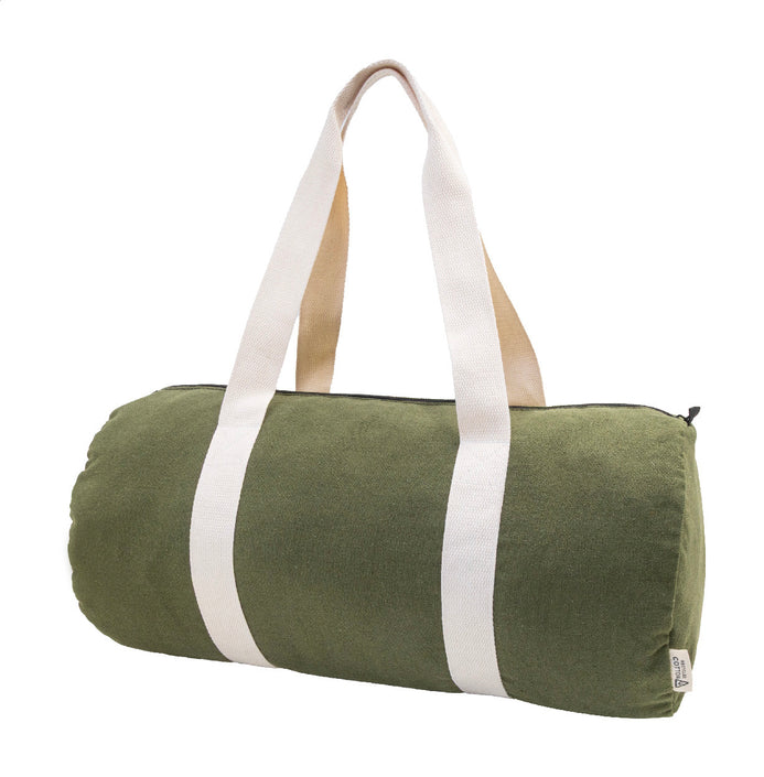 Geantă sport din pânză reciclată, cu compartiment principal cu fermoar, buzunar interior cu fermoar și mânere lungi. 70% bumbac reciclat și 30% poliester reciclat. Cu etichetă distinctivă din bumbac reciclat.