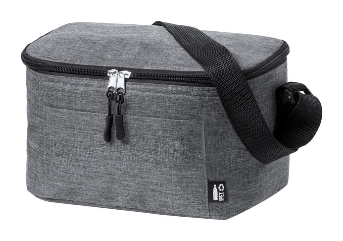 Geantă frigorifică cu fermoar din RPET cu căptușeală din aluminiu, pentru 6 bucăți cutii de 0,33 L. Cu buzunar frontal și curea de umăr reglabilă. Poliester 600D RPET cu etichetă distinctivă RPET.