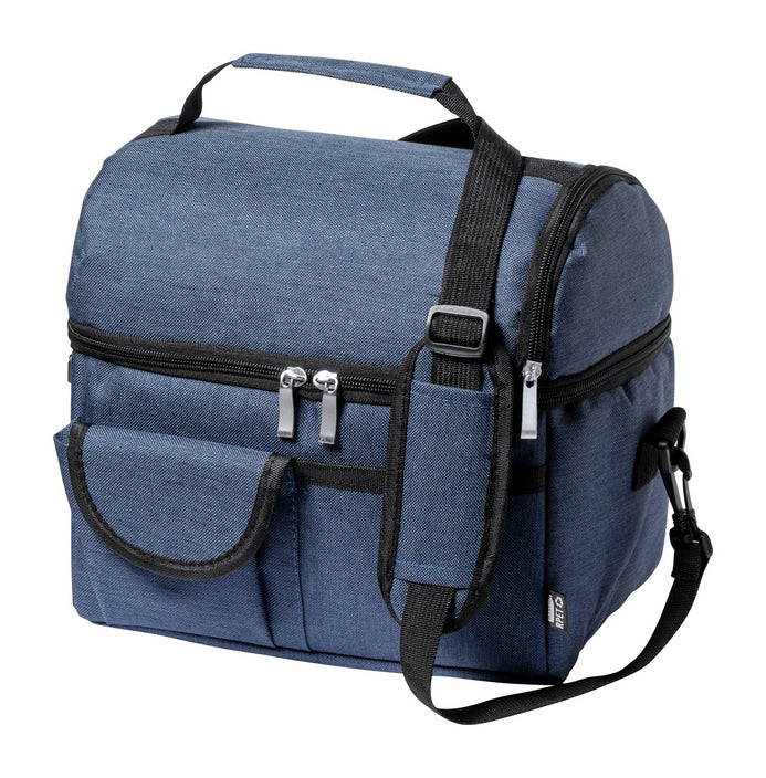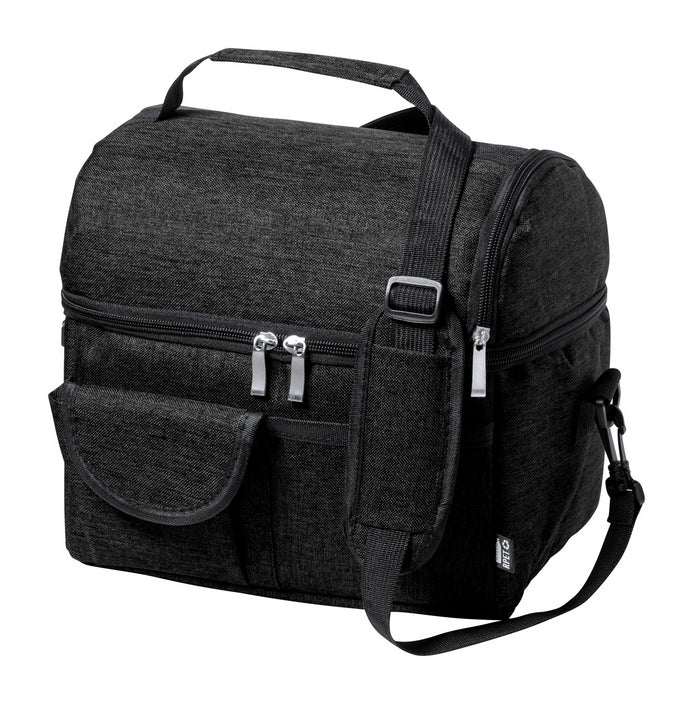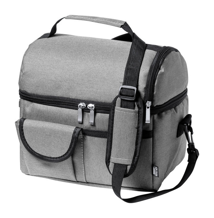 Geantă frigorifică, RPET, cu căptușeală PEVA, compartimente cu fermoar, buzunare frontale, mâner și curea de umăr reglabilă. Cu etichetă distinctivă RPET. Poliester 600D RPET.