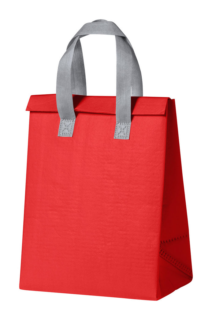 Geantă frigorifică din material nețesut laminat, cu mânere, închidere cu velcro și căptușeală din aluminiu.