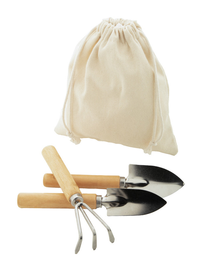 | Descriere | Set de scule de grădină, 3 bucăți, din oțel inoxidabil, cu mânere din lemn, în husă din bumbac cu șnur. Include o furculiță de mână și 2 spatule. |