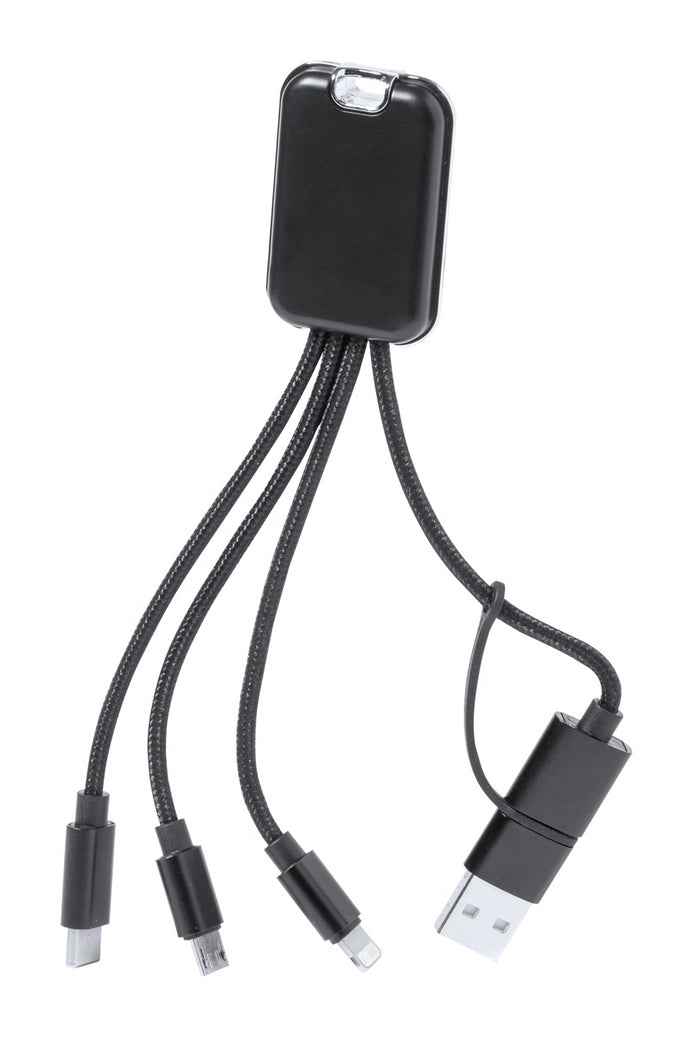 Cablu de încărcare USB, acoperit cu poliester, cu lumină LED în interiorul carcasei pentru gravare iluminată. Cu conectori micro USB, USB-C și Lightning. Cu intrări USB și USB-C.
