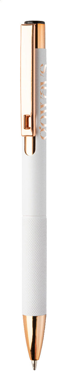 Pix din aluminiu reciclat, cu corp cu finisaj mat, grip texturat și detalii auriu-roz. Cu strat special pentru gravare laser în oglindă, de culoare auriu-roz. Cu mină albastră.