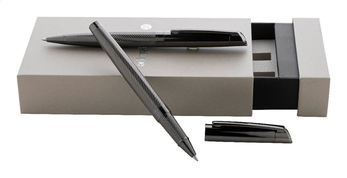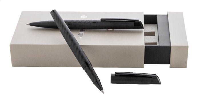 | Descriere | Set elegant de pix și roller, din metal, cu corp texturat diagonal. În cutie cadou în două culori, cu mină albastră. Produs marca André Philippe. |