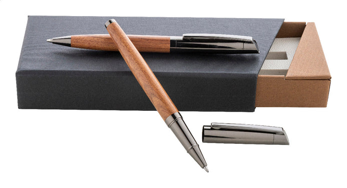 Set elegant de pix și roller din metal, cu corp din lemn și detalii metalice strălucitoare. În cutie cadou în două culori, cu mină albastră. Produs marca André Philippe.