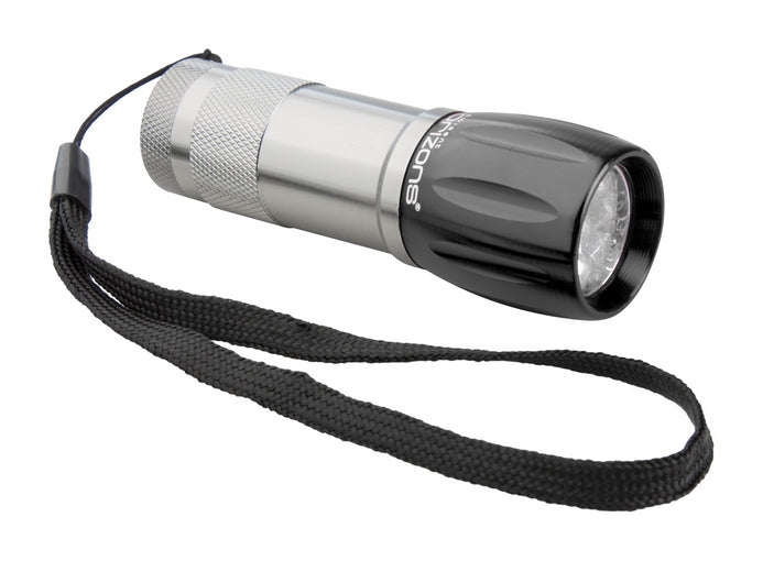 Lanternă din aluminiu cu 9 LED-uri. Funcționează cu 3 baterii AAA/RO. Se livrează fără baterii. Marca Orizons.