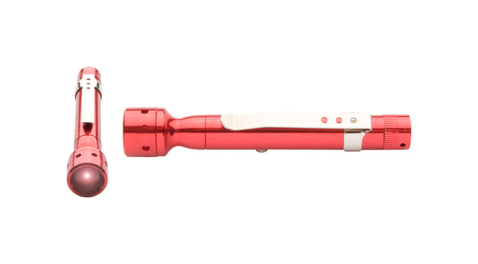 Mini lanternă metalică colorată, cu breloc și clips. Funcționează cu 4 bucăți de baterii AG5. Se livrează fără baterii de tip "button cell".