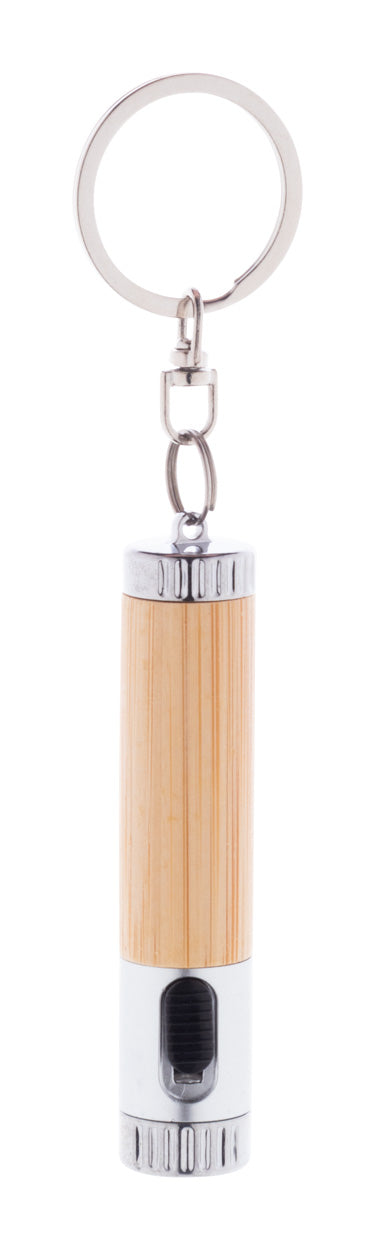 Mini lanternă din bambus și plastic ABS reciclat cu 1 LED și breloc metalic. Cu baterie tip buton.