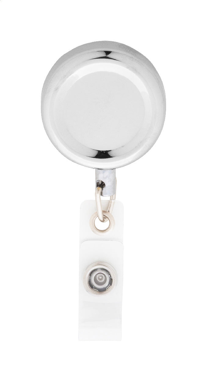 | Descriere | Suport metalic pentru insignă, cu finisaj metalic lucios. Cu închidere cu capsă, fir telescopic și clemă metalică. |