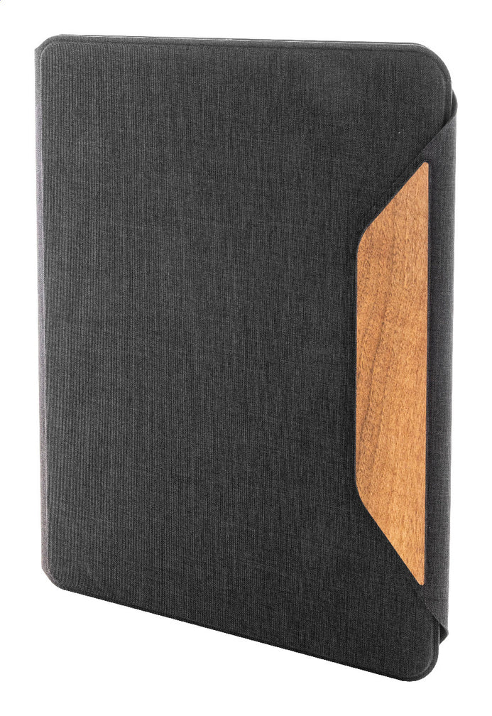 | Descriere | Mapă de documente, format A4, din poliester RPET, cu buzunare interioare multiple și închidere magnetică cu detalii din lemn de nuc. Blocnotes cu 20 de foi dictando, din hârtie reciclată. |