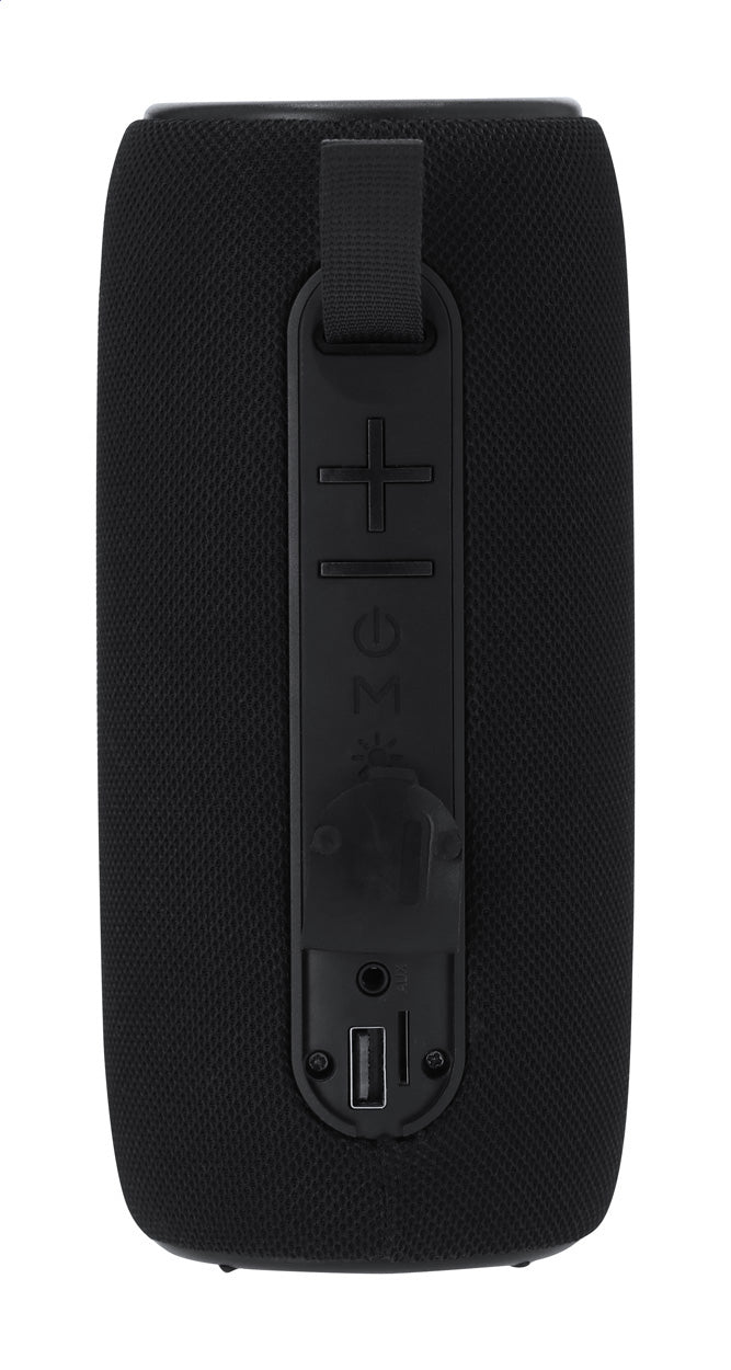 Difuzor bluetooth, acoperit cu țesătură din poliester, lumină LED multicoloră (cu 5 moduri de lumină) și curea de transport. Cu 2 drivere pentru difuzoare, funcție de apel hands-free și baterie reîncărcabilă încorporată (1200 mAh). Inclusiv cablu de încărcare USB.