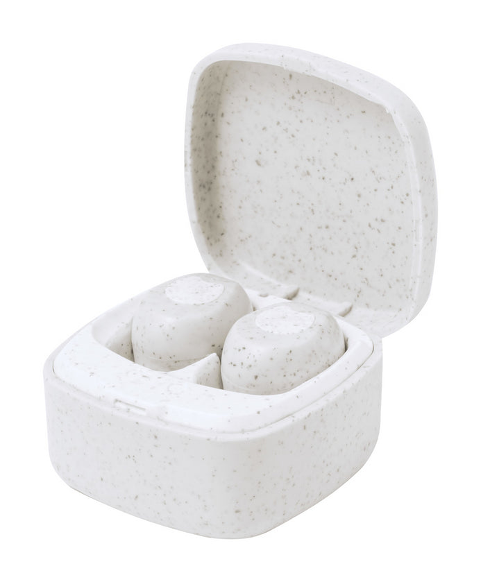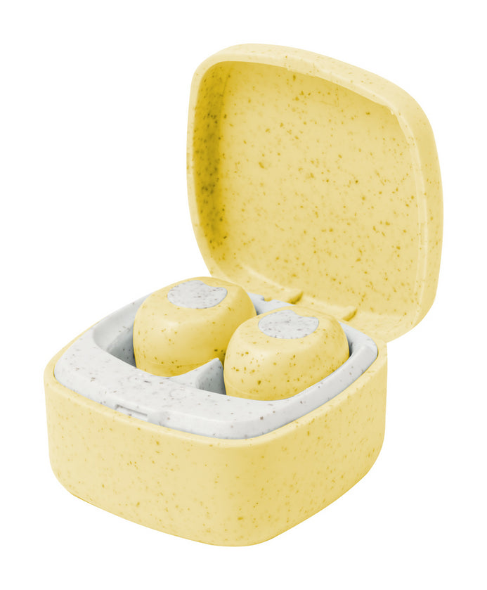 Căști wireless din plastic ecologic din paie de grâu, cu funcție de apel hands-free, în carcasă cu încărcător. Inclusiv cablu de încărcare USB.