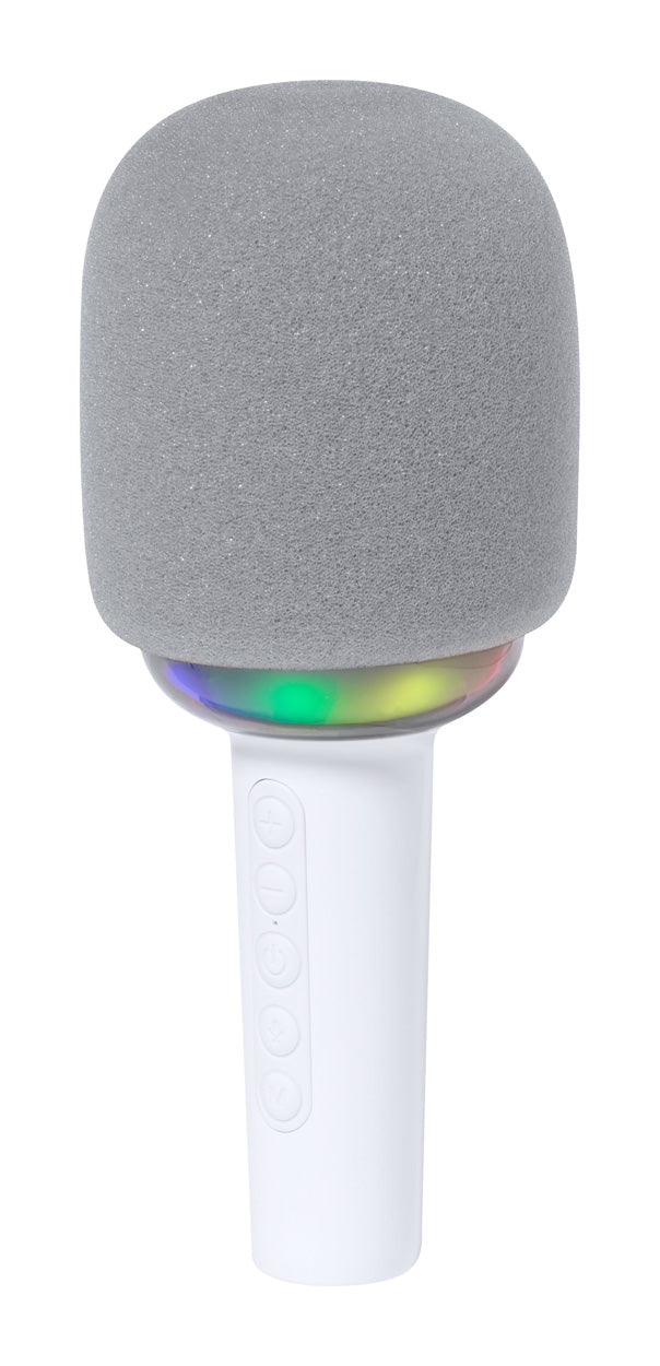 ABS plastic microphone and speaker with bluetooth connection, multicolour LED lights, micro SD player and built-in rechargeable battery. Including USB charger cable.