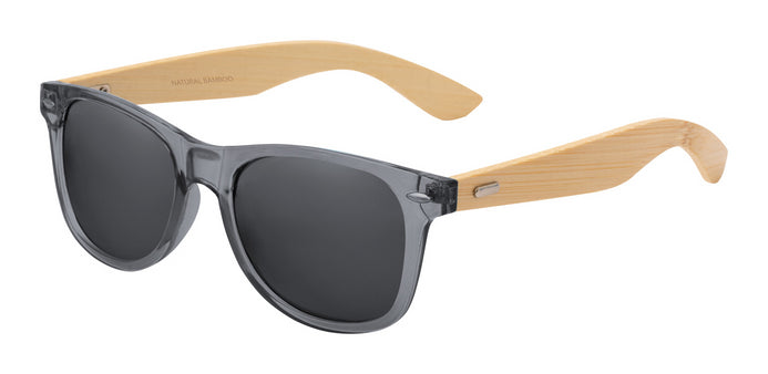 Transparent plastic sunglasses with bamboo temples. With mirrored lenses and UV 400 protection.