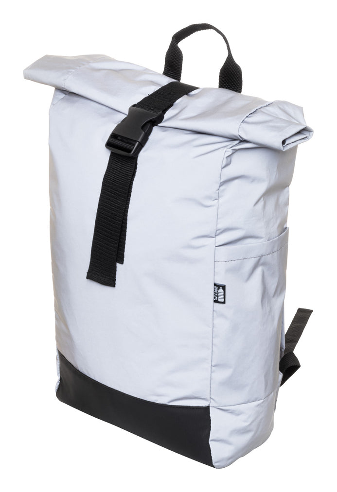 Rucsac rolltop, reflectorizant, din poliester RPET, cu compartiment principal cu inchidere cu cataramă, buzunar ascuns cu fermoar, compartiment căptușit pentru laptop (15"), buzunar lateral, spate și bretele căptușite. Cu etichetă distinctă RPET. Numai pentru uz promoțional, produsul nu se califică drept Echipament de protecție personală.
