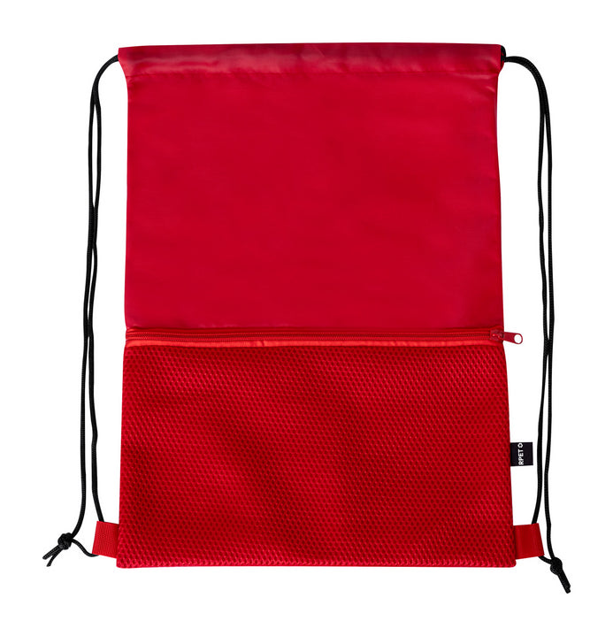 RPET drawstring bag with zipped mesh front pocket. 210D RPET polyester with distinctive RPET label.