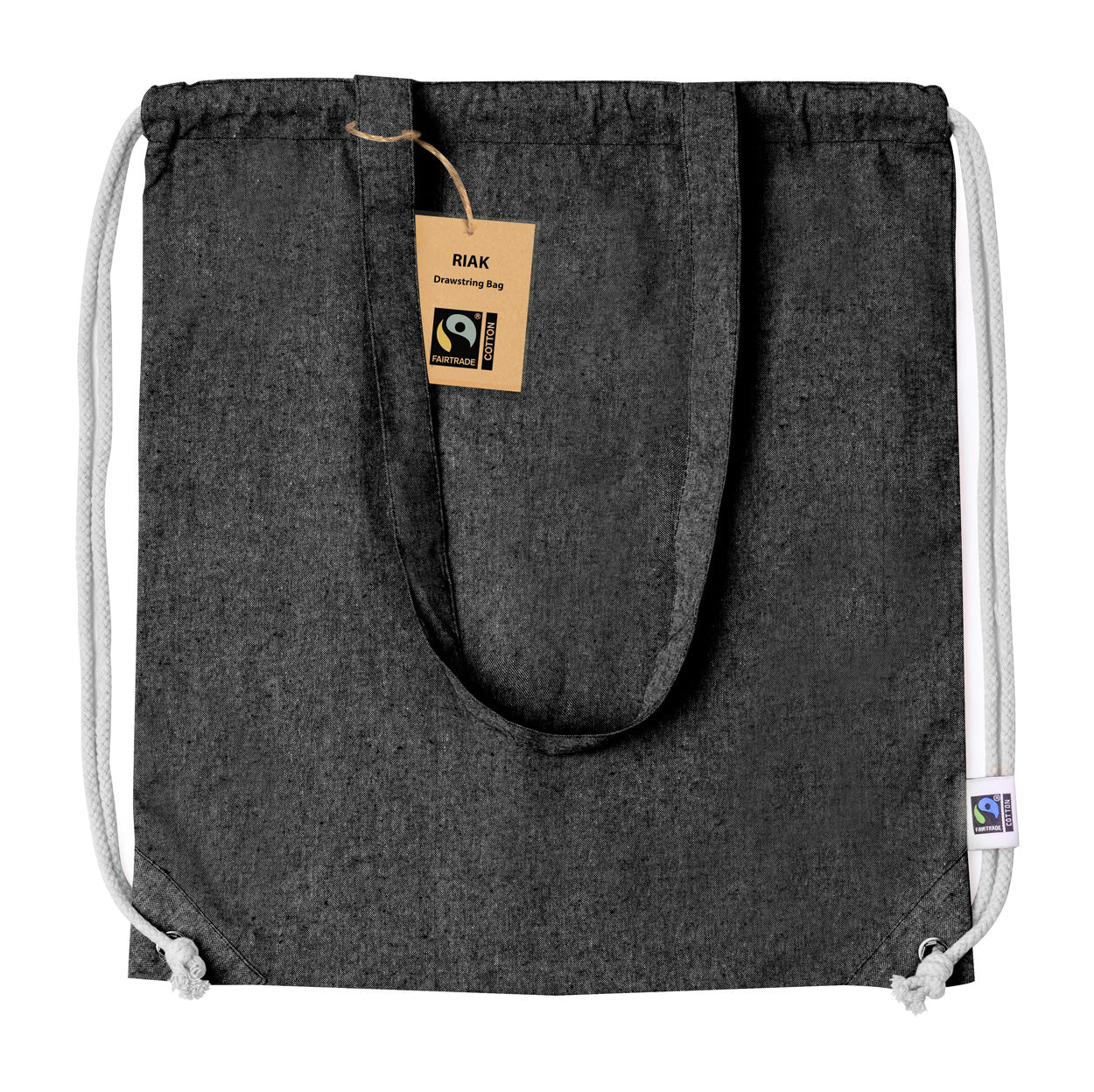 Geantă Fairtrade din bumbac reciclat, cu șnur, cu mânere lungi. Poate fi folosită și ca sacoșă de cumpărături. 100% bumbac Fairtrade, 140 g/m². Cu etichetă distinctă Fairtrade.