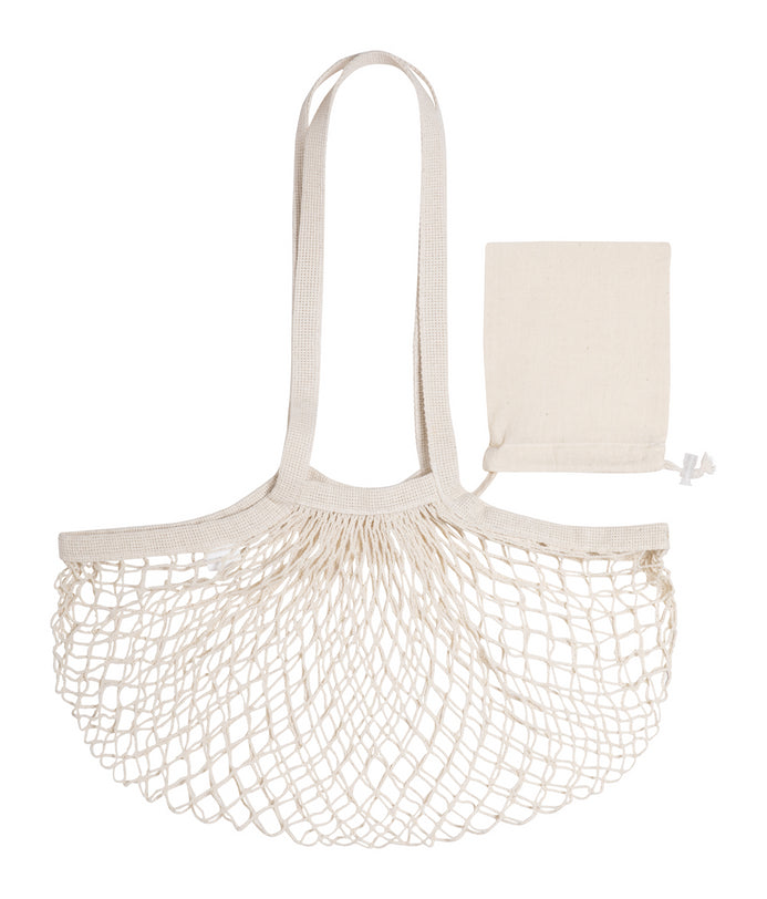 | Descriere | Geantă pentru cumpărături din plasă 100% bumbac, cu mânere lungi. Săculeț mic cu șnur inclus. |