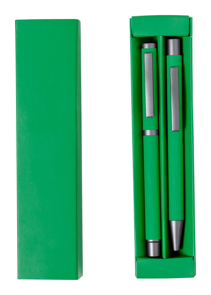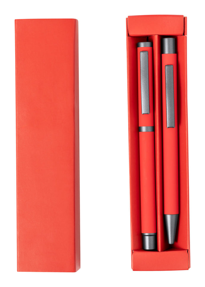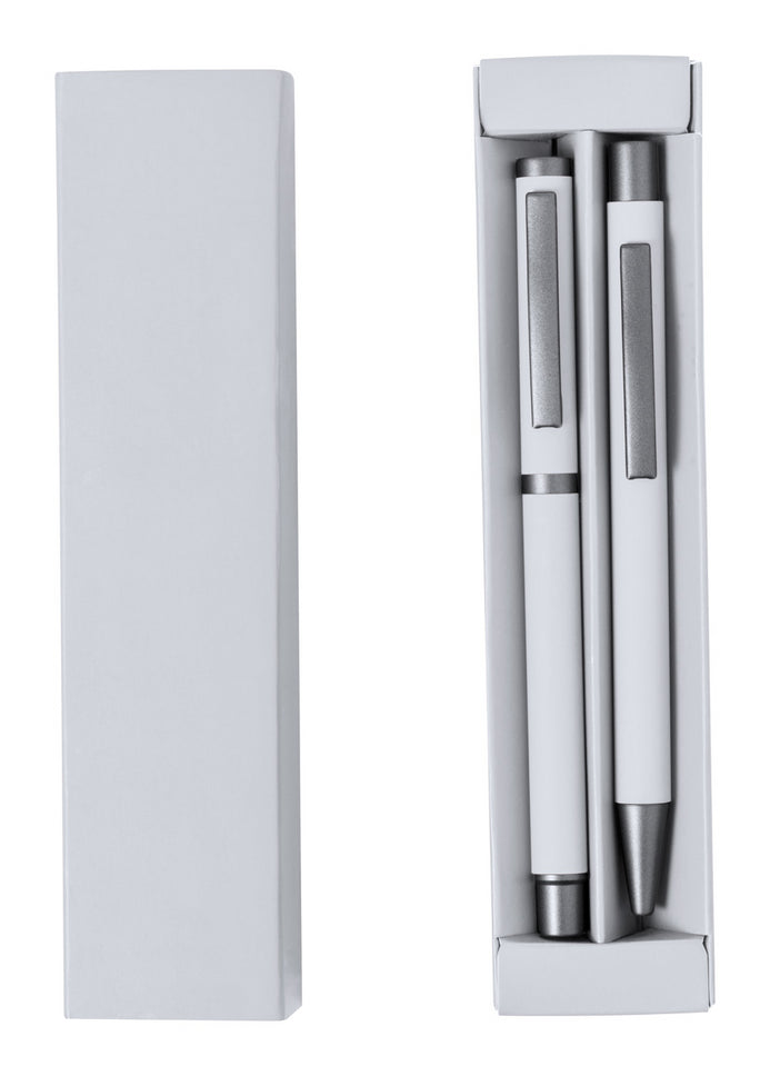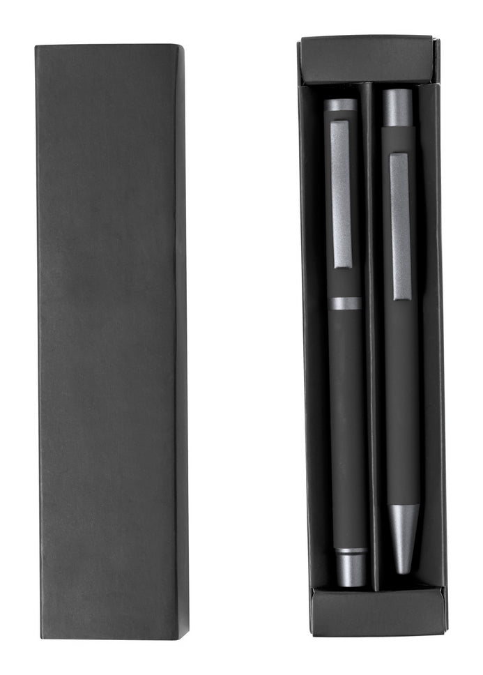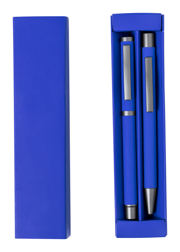 | Descriere | Aluminium ballpoint pen and capped roller pen with metal clip, rubberised finish and blue refill. In gift box. |