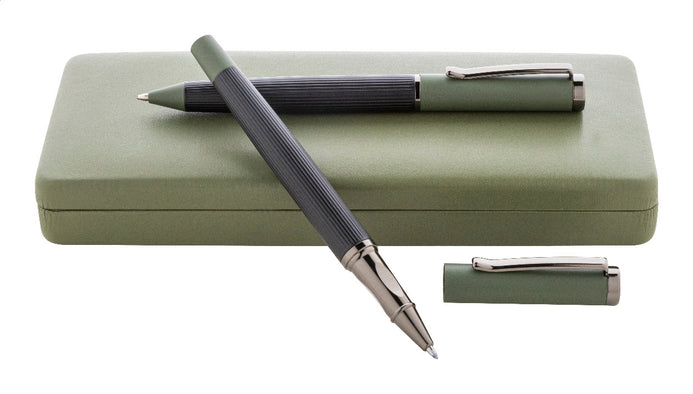 | Descriere | Set elegant de pix și roller, din metal, cu bară în dungi, accente colorate și detalii metalice strălucitoare. În cutie cadou de culoare asortată, cu mină albastră. Produs marca André Philippe. |