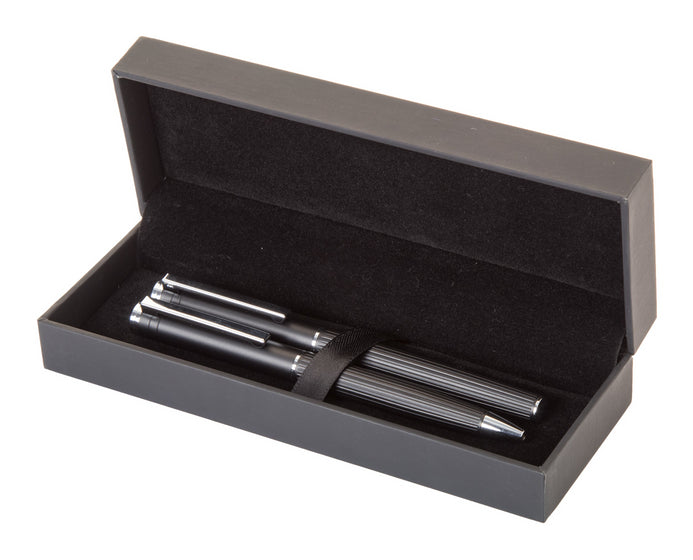 | Descriere | Set elegant de pix și pix roller din aluminiu, cu corp texturat în dungi. În cutie cadou neagră, cu mină albastră. |