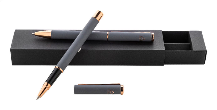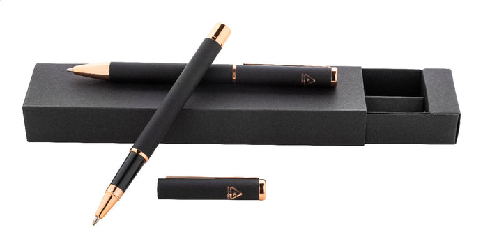 | Descriere | Set pixuri din aluminiu reciclat, cu pix cu bilă și roller, cu finisaj cauciucat și detalii auriu-roz. Cu mină albastră. Cu strat special pentru gravare laser în oglindă, de culoare auriu-roz. În cutie cadou din hârtie neagră. |