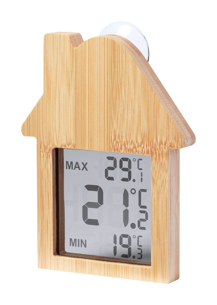 Stație meteo, din bambus, cu ventuză. Cu termometru și funcții de afișare a umidității. Inclusiv baterie tip buton.