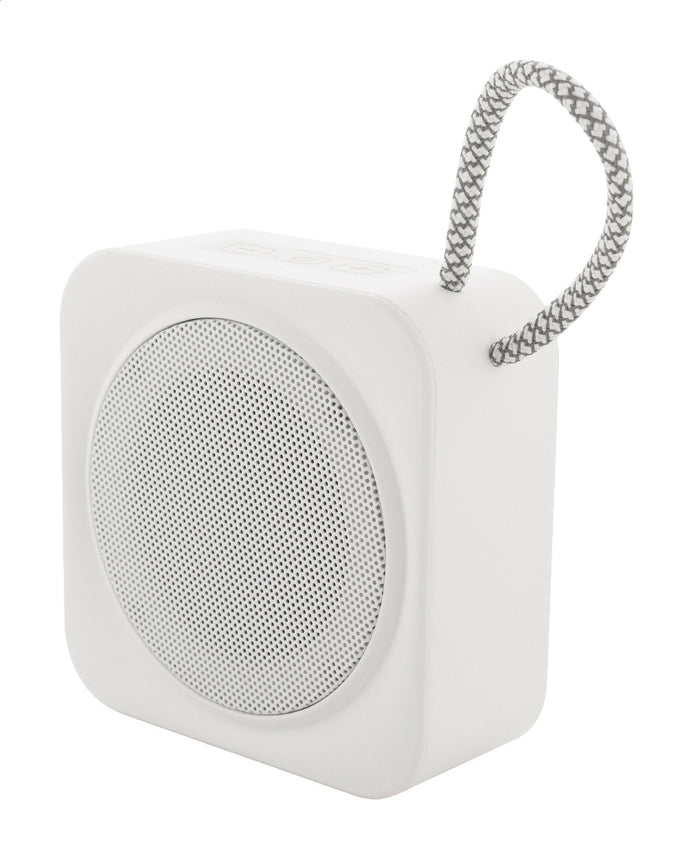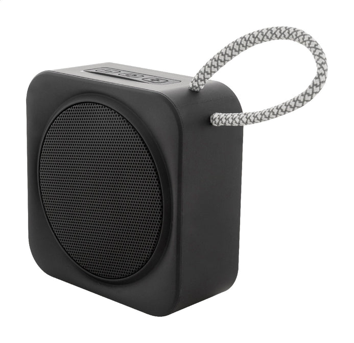 Boxă wireless, din ABS reciclat, cu curea de transport, plasă metalică și baterie reîncărcabilă (300 mAh). Cu funcție de redare MP3 cu card micro SD. Include cablu de încărcare USB.