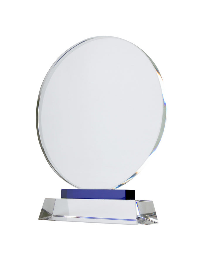 Trofeu cristal pe suport din sticlă. În cutie albastră magnetică din carton, interior din mătase.