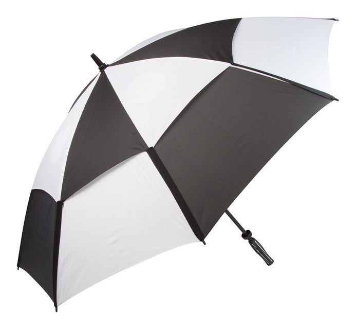 Umbrelă golf alb-negru, antivânt, cu mâner ergonomic, cu husă neagră. Material: pongee.