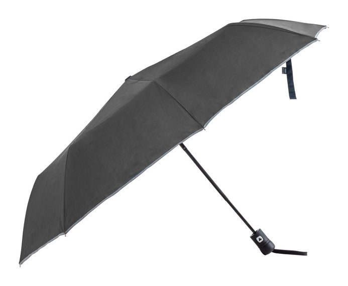 Umbrelă pliabilă automată, rezistentă la vânt, cu 8 panouri, în husă RPET de culoare asortată. Cu ornamente reflectorizante, cadru metalic și nervuri din fibră de sticlă. Pongee 190T RPET. Cu etichetă distinctivă RPET.