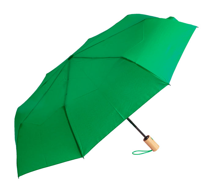 | Descriere | Umbrelă pliabilă, complet automată (deschidere/închidere), rezistentă la vânt, cu 8 panouri, în husă de culoare asortată. Cu cadru metalic, nervuri din fibră de sticlă și mâner din bambus. Pongee 190T RPET. Cu etichetă distinctivă RPET. |