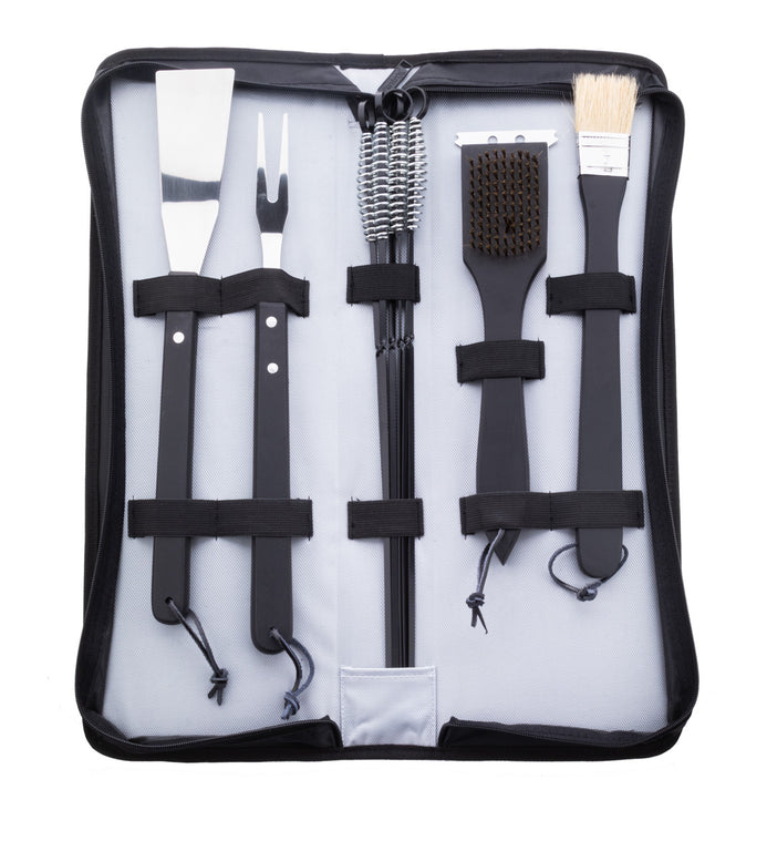 Set pentru grătar, din oțel inoxidabil, alcătuit din 5 bucăți, cu geantă de transport cu fermoar.