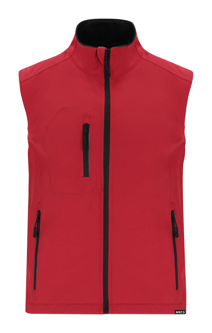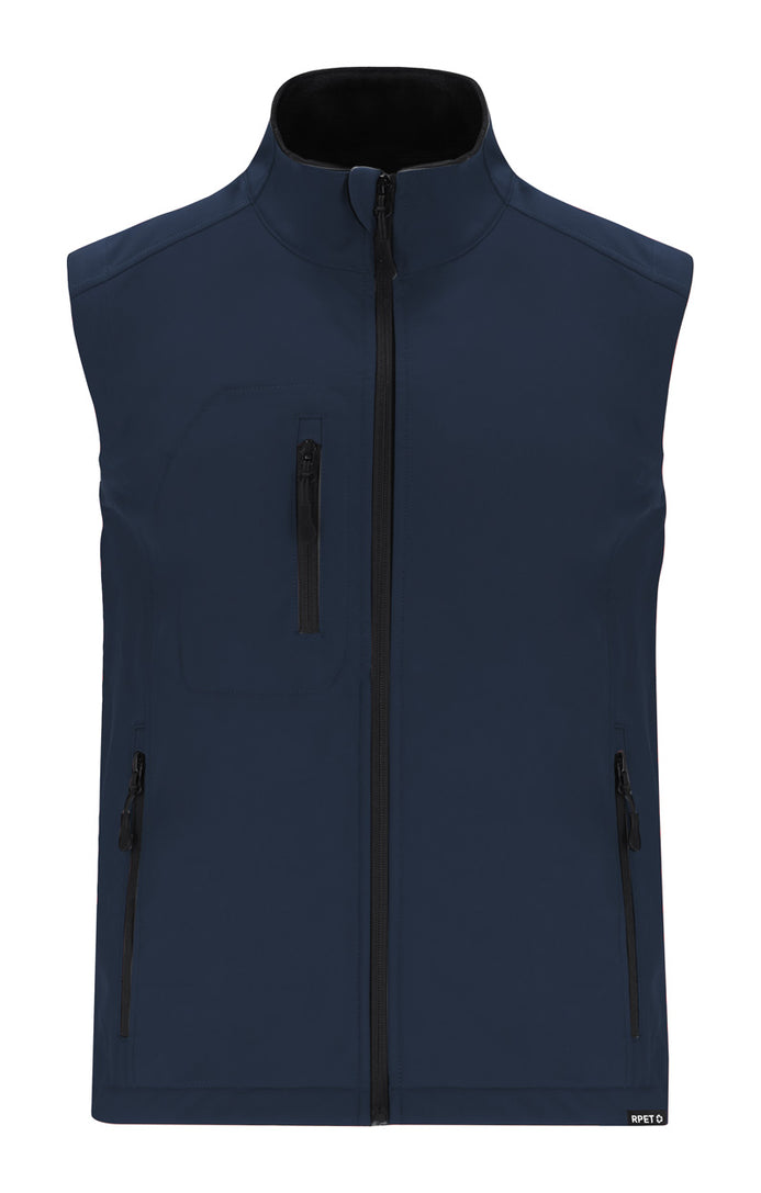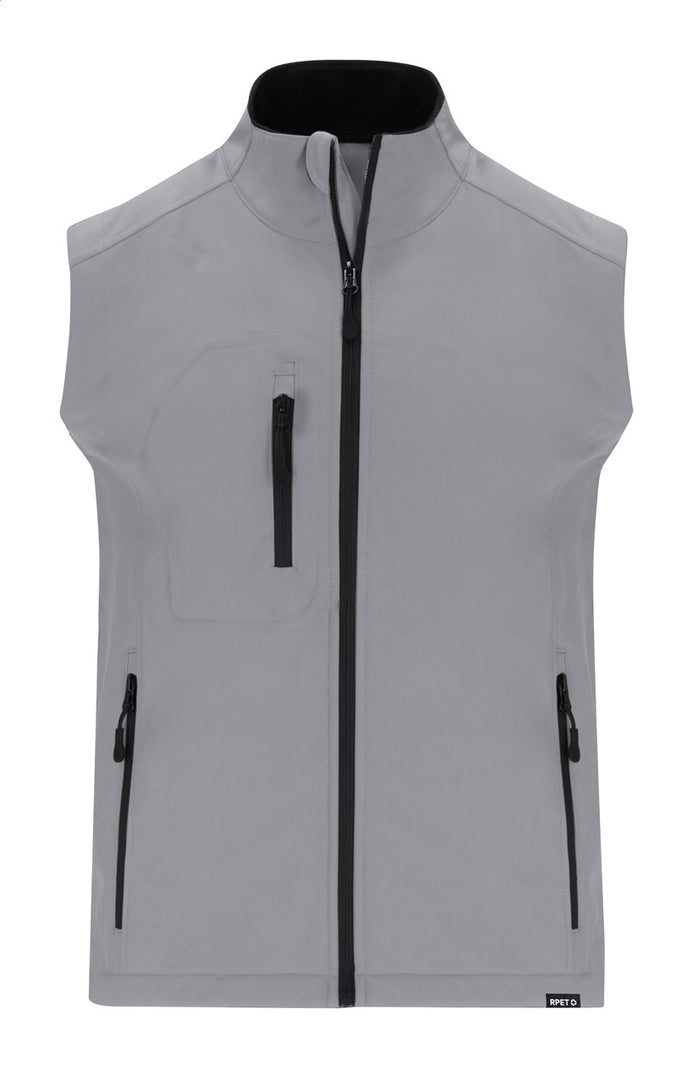 Vestă cu trei straturi, rezistentă la vânt și la apă, cu fermoar RPET, cu buzunare laterale și pe piept. Exterior: 94% poliester RPET și 6% elastan. Interior: 100% lână polară din poliester RPET. 340 g/m².
