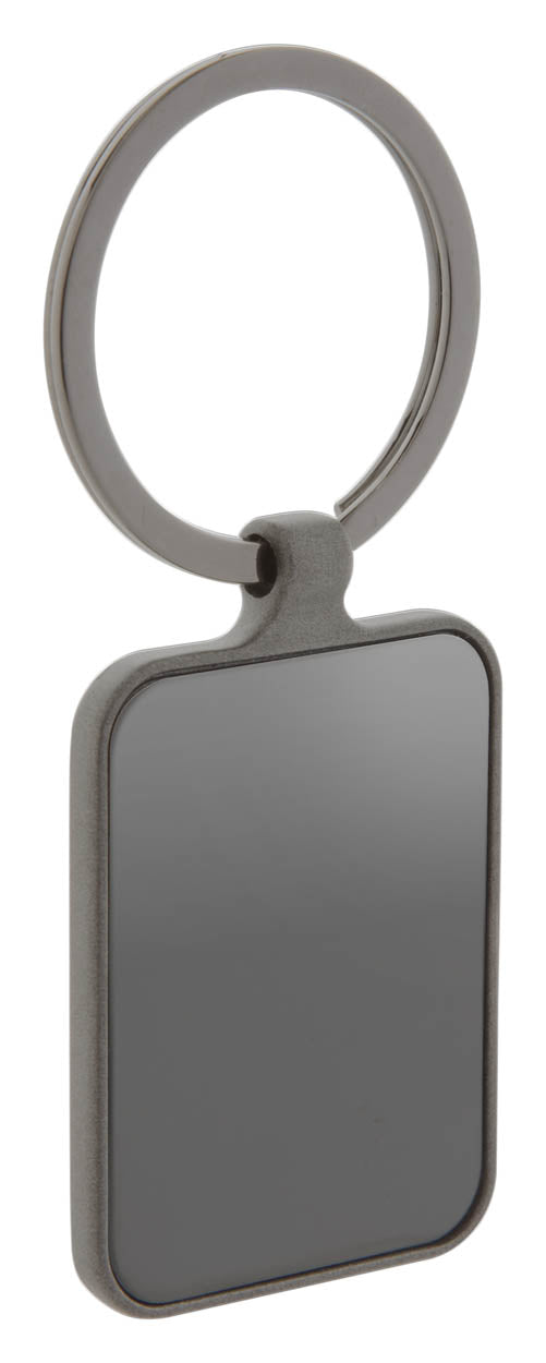Breloc dreptunghiular din metal cu finisaj metalic și suprafeţe strălucitoare pe ambele părți.