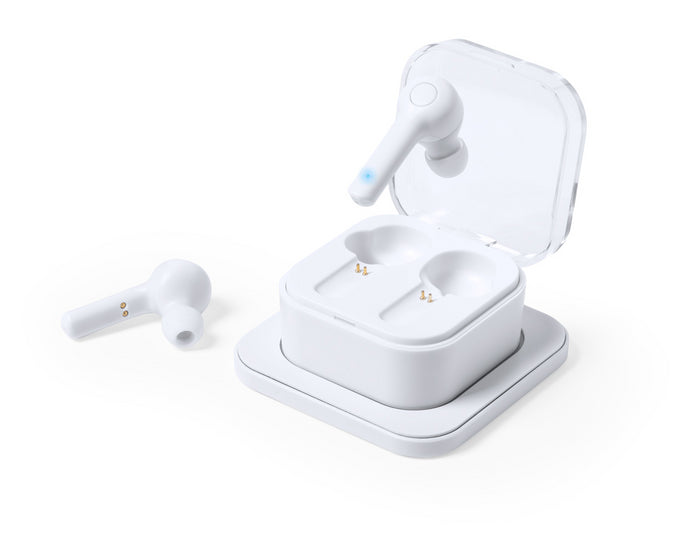 Căști bluetooth wireless cu funcție de apelare hands-free, în carcasă de încărcare din plastic, care pot fi încărcate wireless. Inclusiv baza încărcătorului wireless (ieșire max.: 1000 mA) cu cablu de încărcare USB.